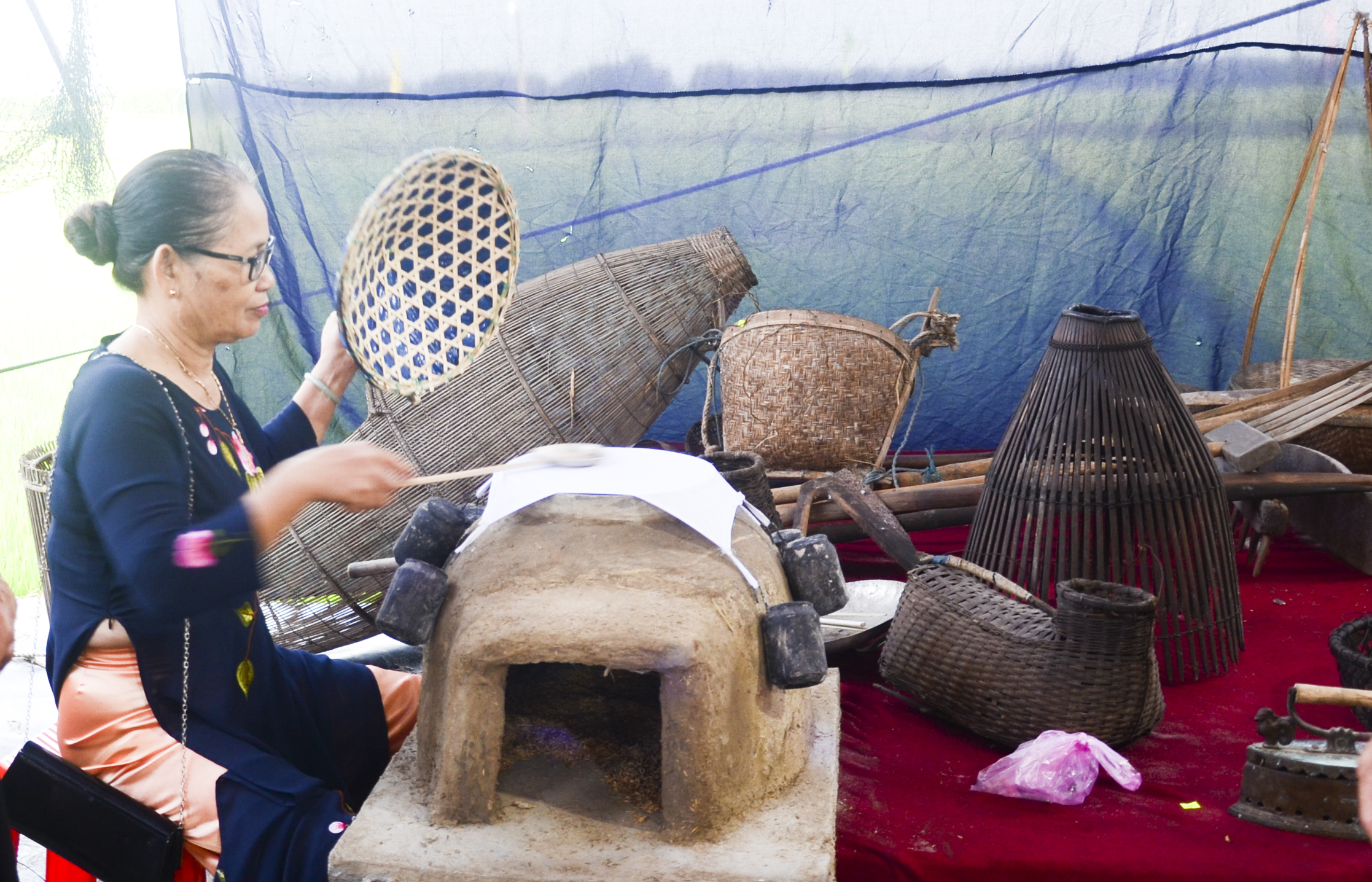 Tôi ấn tượng với cối xay lúa bằng tre mộc mạc. Đang nghĩ chắc chỉ trưng bày cho vui thì một cụ ông bước tới, xúc lúa đổ vào, tay vận trục quay, tiếng cối nghiến lúa lụp cụp, ngay lập tức gạo ra đằng gạo trấu ra đằng trấu. Hóa đấy là cụ Nguyễn Trường, người làm ra cái cối này. Năm nay cụ đã tám mươi ba tuổi và mấy chục năm nay vẫn bền bỉ làm cối, giữ nghề truyền thống của gia đình. Cụ kể khi lên mười đã theo ông nội đi khắp vùng đóng cối cho người ta. Lúc đó đóng cối không nhận tiền công mà nhận bằng lúa. Bây giờ thì chẳng ai dùng cối xay này, nhưng cụ vẫn nhận làm thường xuyên cho các khu du lịch, các bảo tàng và người sưu tập trong nước. Mỗi cái cụ làm tầm tám ngày thì xong, và tiền họ trả cũng khá lắm. Cụ móm mém cười, nói thù lao cao hơn xưa nhiều, nhưng không phải ai cũng làm được đâu. Làm cái này đòi hỏi chọn tre và gỗ thật kỹ, rồi tỉ mẩn từng chi tiết nó mới xay ra gạo được. Dù là hàng trưng bày, nhưng cụ giữ nguyên các “tiêu chuẩn kỹ thuật” của bí quyết gia truyền.