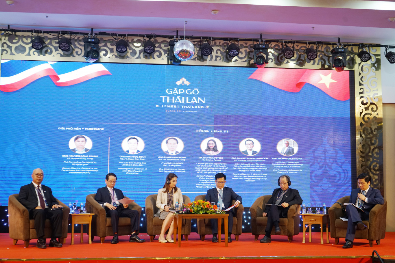 Tại Hội nghị “Gặp gỡ Thái Lan”, đại biểu của 2 nước Việt Nam - Thái Lan đã tham gia 2 phiên thảo luận về năng lượng tái tạo và nông nghiệp công nghệ cao; hội nhập chuỗi cung ứng và thúc đẩy hợp tác trên Hành lang kinh tế Đông - Tây (EWEC). Đây là 2 chủ đề nhận được sự quan tâm của các bên để huy động nguồn lực nhằm phát triển đất nước, các địa phương, trong đó có Quảng Trị, nhanh và bền vững trong thời gian tới. Hai phiên thảo luận với sự tham gia của nhiều chuyên gia, doanh nghiệp đến từ Thái Lan, Việt Nam: Bà Karittiya Petsee, Chuyên gia cao cấp về phân tích chính sách và kế hoạch, Bộ Năng lượng Thái Lan; ông Somkiet Pongpiyapaiboon, Giám đốc quốc gia, Tập đoàn năng lượng B.Grimm Việt Nam; ông Wichan Chummanya, Tập đoàn CP Việt Nam; bà Somhatai Panichewa, Tập đoàn Amata Việt Nam; Tiến sĩ Boonsub Panichakarn, Đại học Naresuan kiêm Chủ tịch Mạng lưới học thuật về logistics ASSEA; ông Worawut Smuthkakin, Bộ Ngoại giao Thái Lan; đại diện lãnh đạo các tỉnh Điện Biên, Nghệ An, Quảng Bình, Thừa Thiên Huế, Quảng Trị. Các diễn giả đã thẳng thắn trao đổi, giới thiệu, quảng bá về tiềm năng, thế mạnh, chính sách thu hút đầu tư của các địa phương cũng như của hai quốc gia. | ||