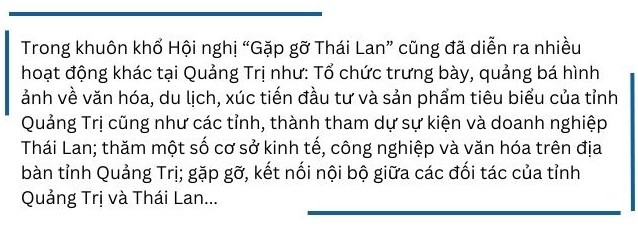 Quảng Trị vinh dự là tỉnh đầu tiên được đăng cai tổ chức Hội nghị “Gặp gỡ Thái Lan” tại Việt Nam, đây là diễn đàn mở đường cho quan hệ hợp tác mọi mặt trong tương lai giữa các địa phương Thái Lan với các địa phương Việt Nam. Đồng thời là cơ hội quảng bá và xúc tiến đầu tư của các doanh nghiệp, nhà đầu tư hàng đầu của Thái Lan và từ Thái Lan vào Việt Nam và tỉnh Quảng Trị. | ||