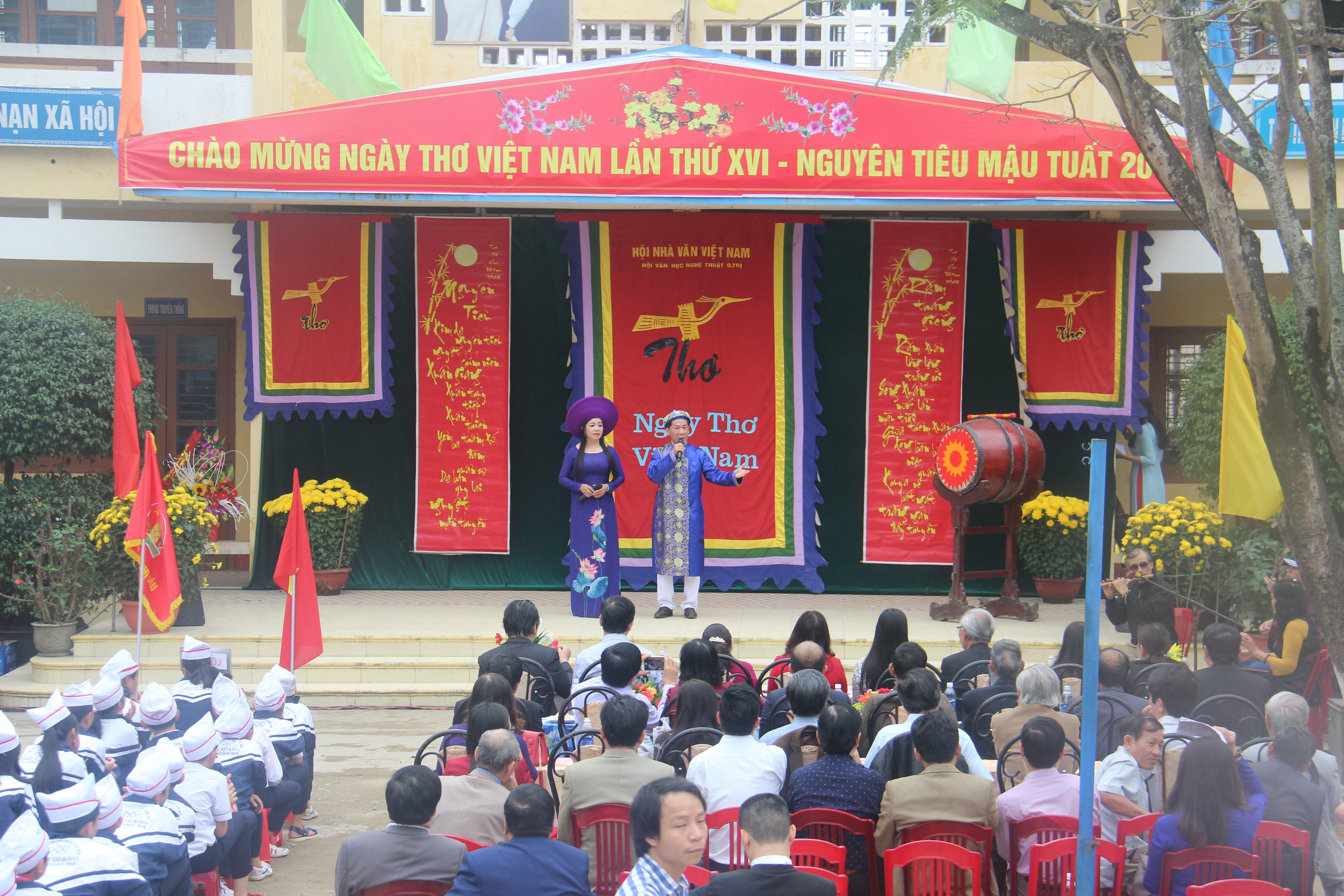Chiều cùng ngày, Hội VHNT tỉnh phối hợp với trường THCS Hiếu Giang (Đông Hà, Quảng Trị) tổ chức Ngày thơ Việt Nam lần thứ XVI (Nguyên tiêu Mậu Tuất, 2018) với chủ đề “Văn học nghệ thuật đồng hành cùng đất nước”. Tham dự có đồng chí Nguyễn Đăng Quang, Ủy viên Thường vụ Tỉnh ủy, Chủ tịch UBMTTQVN tỉnh, các đồng chí lãnh đạo các sở, ban, ngành của tỉnh, thành phố Đông Hà, Ban Giám hiệu, giáo viên, học sinh Trường THCS Hiếu Giang, lãnh đạo Hội Văn học Nghệ thuật tỉnh, các văn nghệ sĩ và những người yêu thơ.