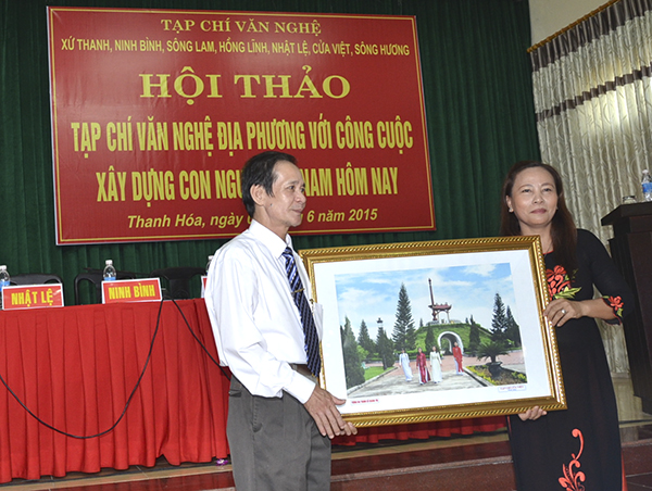 Nhà văn Thùy Liên (TBT Cửa Việt) tặng quà lưu niệm cho Tạp chí Xứ Thanh
