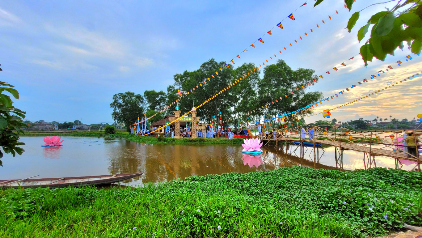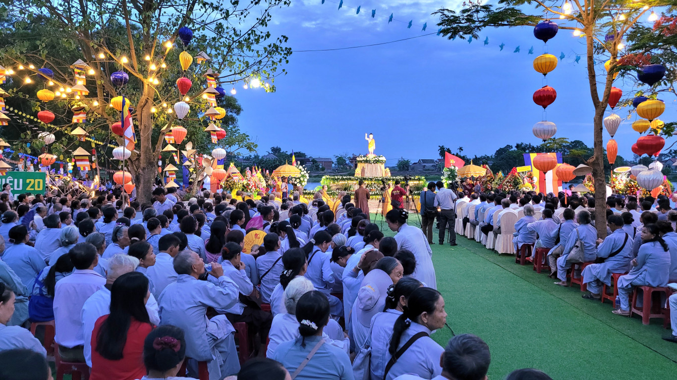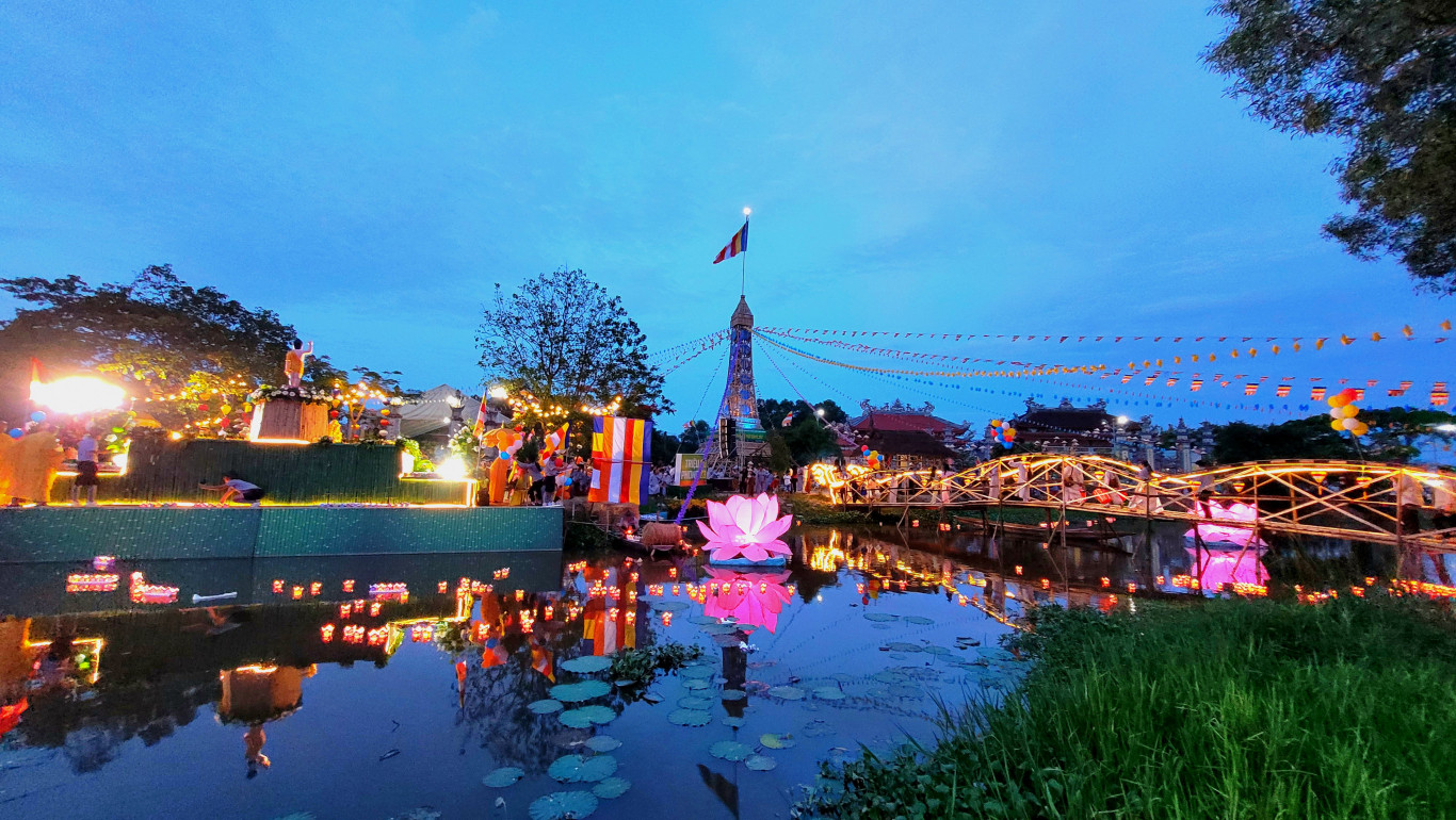 Trên dòng sông làng Lệ Xuyên, bảy đóa sen rực sáng ánh đèn được bố trí nổi giữa mặt nước để tượng trưng cho bảy bước chân ngày Đức Phật đản sanh. Bên gò đất là triển lãm nghệ thuật mô hình cuộc đời Đức Phật từ sơ sanh, xuất gia, thành đạo. ![]() Lễ chính thức diễn ra chiều ngày mùng 8 tháng Tư Quý Mão (26/5/2023) có sự tham dự của lãnh đạo giáo hội, lãnh đạo chính quyền, mặt trận tỉnh Quảng Trị, huyện Triệu Phong và đông đảo phật tử các giới. Điểm nhấn của chương trình là thả bồ câu, bóng bóng nguyện cầu hòa bình, chúng sanh an lạc và pháp hội hoa đăng thắp sáng dòng sông. ![]() Cũng nhân dịp này giáo hội xuất bản ấn phẩm Tịnh Quang số đầu tiên, nội dung thông tin về các hoạt động phật sự, các nghiên cứu lịch sử văn hóa, văn học nghệ thuật. Bên cạnh đó còn có các chương trình của Gia đình Phật tử như: cắm trại, hội thi Theo dấu chân Phật, văn nghệ chủ đề Hương sen đầu hạ... tạo nên một không gian lễ hội đa sắc, sinh động, hấp dẫn. ![]() | ||