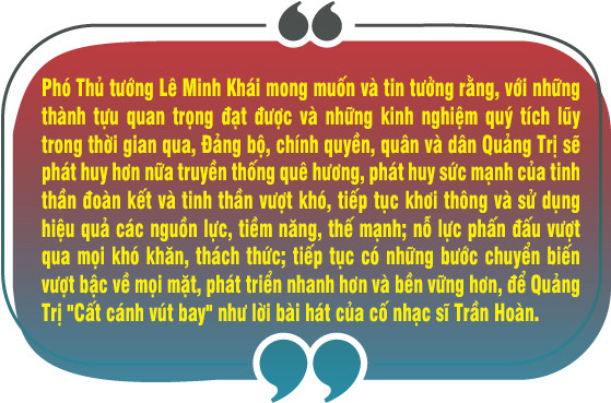 Chính phủ Cách mạng Lâm thời Cộng Cộng hòa miền Nam Việt Nam đã tham gia các phong trào, tổ chức tiến bộ trên thế giới, cử nhiều đoàn cao cấp tham dự các hội nghị quốc tế, thăm các nước; ra tuyên bố vạch trần âm mưu của Mỹ giúp chính quyền Sài Gòn vi phạm hiệp định Paris, tiếp tục gây tội ác với nhân dân, vận động các nước tiếp tục ủng hộ mạnh mẽ nhân dân Việt Nam…; đề ra nhiều chủ trương, chính sách trên các lĩnh vực chính trị, kinh tế, văn hóa, xã hội, quốc phòng, an ninh nhằm xây dựng, củng cố vùng giải phóng và các lực lượng cách mạng vững về mọi mặt… ![]() Chủ tịch Nguyễn Hữu Thọ và Bộ trưởng Bộ Ngoại giao Nguyễn Thị Bình tại nhà trình Quốc thư (Trụ sở Chính phủ Cách mạng lâm thời Cộng hòa miền Nam Việt Nam tại Cam Lộ, Quảng Trị) năm 1973. Việc đưa trụ sở Chính phủ Cách mạng Lâm thời Cộng Cộng hòa miền Nam Việt Nam về Quảng Trị thể hiện tầm nhìn chiến lược của Đảng. Nâng cao biểu tượng ý chí cách mạng. Trong thời gian chỉ 3 năm (1973 - 1976), nhưng Chính phủ Cách mạng lâm thời Cộng hòa miền Nam Việt Nam đóng tại Quảng Trị đã có những đóng góp quan trọng cùng quân và dân ta đưa cuộc kháng chiến chống Mỹ cứu nước đi đến thắng lợi hoàn toàn và tổng tuyển cử thống nhất 2 miền Nam Bắc. ![]() Nửa thế kỷ Quảng Trị được vinh dự chọn là nơi đặt Trụ sở Chính phủ Cách mạng lâm thời Cộng hòa miền Nam Việt Nam, Đảng bộ và nhân dân Quảng Trị luôn trăn trở vượt lên chính mình và đi lên cùng cả nước, “Những ruộng đói mùa, những đồng đói cỏ, những đồi sim không đủ quả nuôi người...” trong lời thơ Chế Lan Viên-một người con quê hương Cam Lộ, nay là màu xanh ngút ngàn của cà phê, hồ tiêu, của dược liệu, của cuộc sống ấm no, hạnh phúc. ![]() Phát biểu đáp từ, đồng chí Lê Quang Tùng, UVTW Đảng, Bí thư Tỉnh ủy Quảng Trị cám ơn sự tham dự lễ của các đồng chính lãnh đạo Đảng, Nhà nước, các bộ ban ngành và Nhân dân và nhấn mạnh: Những ghi nhận và chỉ đạo sâu sắc của Phó Thủ tướng Lê Minh Khái là nguồn động viên to lớn, là định hướng hết sức quan trọng đối với Đảng bộ, Chính quyền và nhân dân tỉnh Quảng Trị trong chặng đường phát triển tiếp theo. Kế thừa và phát huy truyền thống yêu nước, cách mạng của quê hương anh hùng và để xứng đáng là vùng đất được chọn làm nơi đặt Trụ sở Chính phủ Cách mạng lâm thời cộng hòa miền Nam Việt Nam, Đảng bộ, chính quyền và Nhân dân Quảng Trị đã và đang nỗ lực phấn đấu khơi dậy và phát huy mọi tiềm năng, lợi thế, huy động mọi nguồn lực, động lực thực hiện thắng lợi Nghị quyết Đại hội đại biểu toàn quốc lần thứ XIII của Đảng và Nghị quyết Đại hội đại biểu Đảng bộ tỉnh lần thứ XVII, quyết tâm hiện thực hóa lời nhắn nhủ tâm huyết của đồng chí Tổng Bí thư Nguyễn Phú Trọng đối với Đảng bộ và Nhân dân Quảng Trị trong một lần về thăm tỉnh, đó là: “Ngoài những tiềm năng sẵn có thì với Quảng Trị, truyền thống cách mạng anh hùng cũng là một nguồn lực, động lực để thúc đẩy phát triển. Tỉnh Quảng Trị đã anh hùng trong chiến đấu, phải thành công trong kiến thiết, dựng xây... Đảng bộ tỉnh từng được tôi luyện qua thử thách, phải thực sự là hạt nhân, là đầu tàu, phải là một “lũy thép” vững vàng, đoàn kết thống nhất cao để đưa QuảngTrị bứt phá đi lên”. | ||