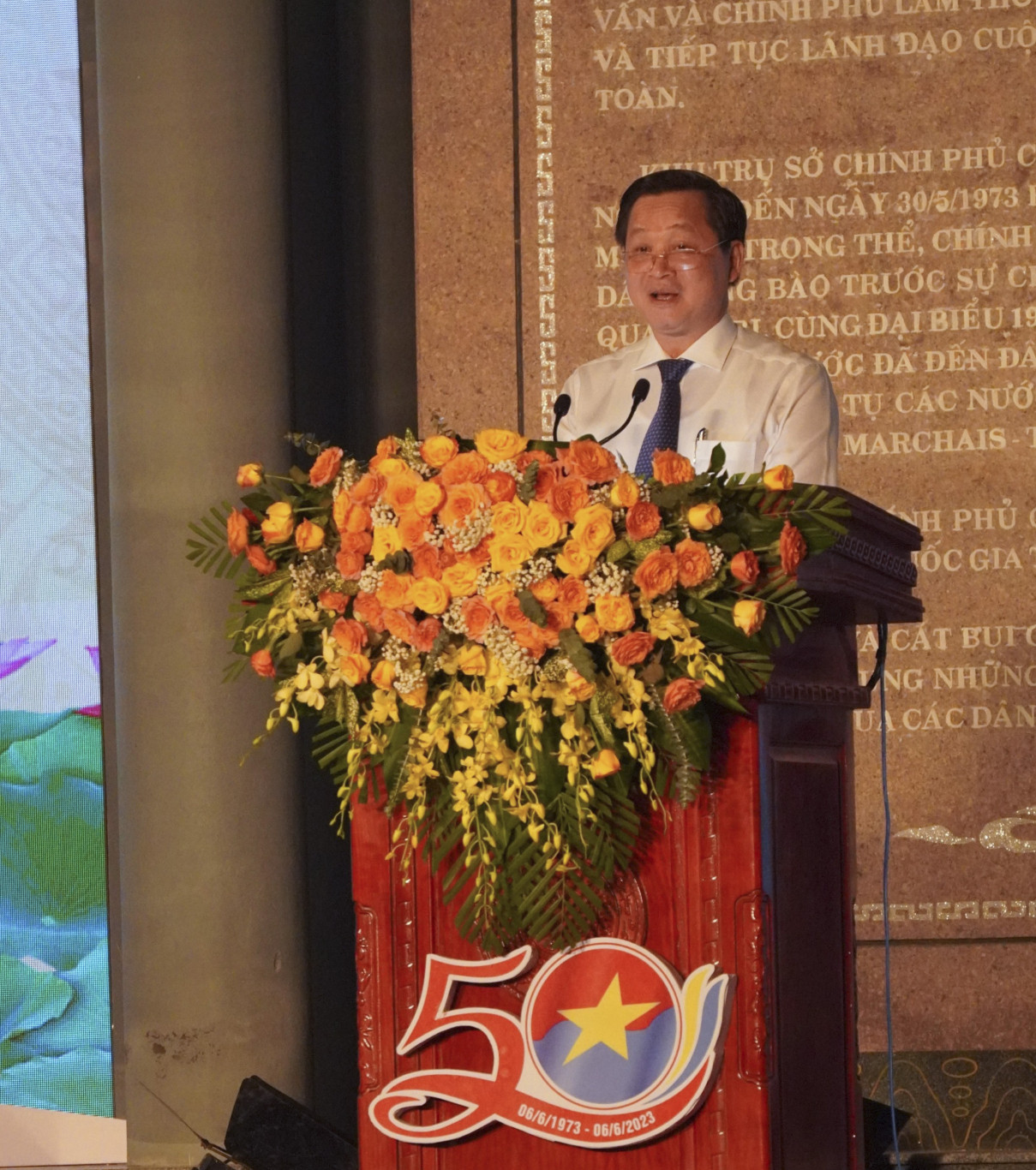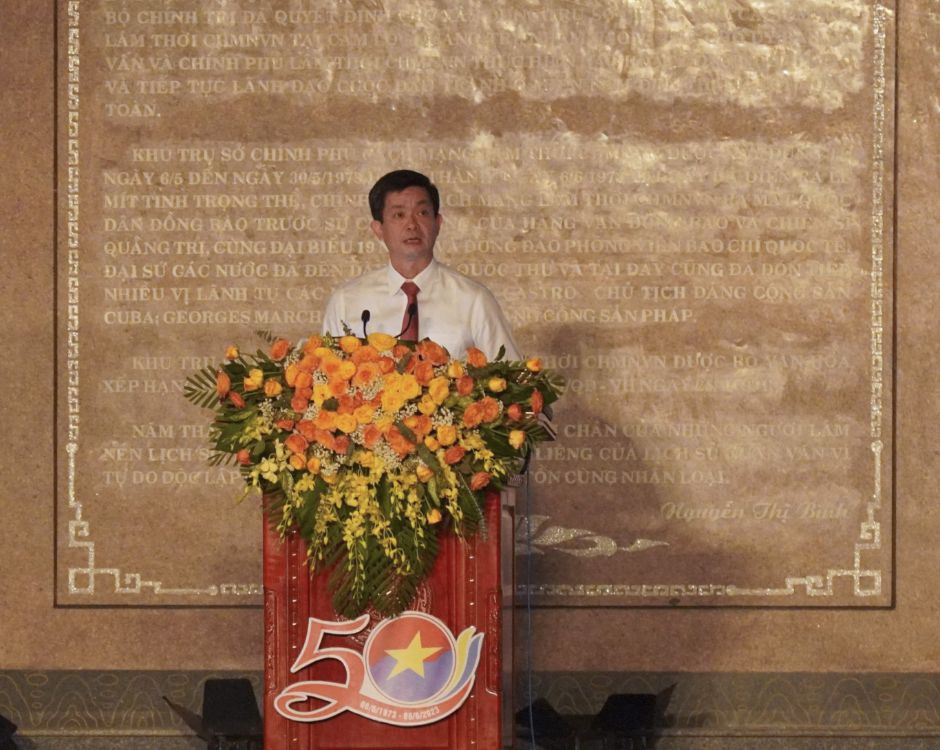 Lễ kỷ niệm có sự tham dự của các đồng chí Lãnh đạo Đảng, Nhà nước, Ủy ban Trung ương mặt trận tổ quốc Việt Nam; lãnh đạo các Ban, Bộ ngành, đoàn thể Trung ương; các đồng chí lãnh đạo tỉnh Quảng Trị; đại diện lãnh đạo một số tỉnh, thành trong nước;... cùng đông đảo cán bộ, Nhân dân. ![]() Trong bài phát biểu, Phó Thủ tướng Lê Minh Khái đã ôn lại lịch sử của Trụ sở Chính phủ cách mạng lâm thời Cộng hòa miền Nam Việt Nam tại Cam Lộ cũng như vai trò vị thế tỉnh Quảng Trị. Cách đây 50 năm, ngay sau khi Hiệp định Pari về chấm dứt chiến tranh, lập lại hòa bình ở Việt Nam được ký kết, để thực hiện các yêu cầu, nhiệm vụ đối nội và đối ngoại, chuẩn bị cho cuộc Tổng tiến công giải phóng miền Nam, thống nhất đất nước, Chính phủ Cách mạng lâm thời Cộng hòa miền Nam Việt Nam đã chuyển trụ sở từ Tây Ninh ra vùng giải phóng Quảng Trị. Huyện Cam Lộ, tỉnh Quảng Trị đã vinh dự được chọn làm nơi đóng trụ sở. | ||