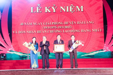Tối qua 18/3/2015, Huyện ủy, UBND, UBMTTQVN huyện Hải Lăng (Quảng Trị) long trọng tổ chức lễ kỷ niệm 40 năm ngày giải phóng huyện 19/3 (1975 - 2015) và đón nhận Huân chương Lao động hạng Nhất. Dự buổi lễ có các đồng chí: Lê Hữu Phúc, UVTƯ Đảng, Bí thư Tỉnh ủy, Chủ tịch HĐND tỉnh...