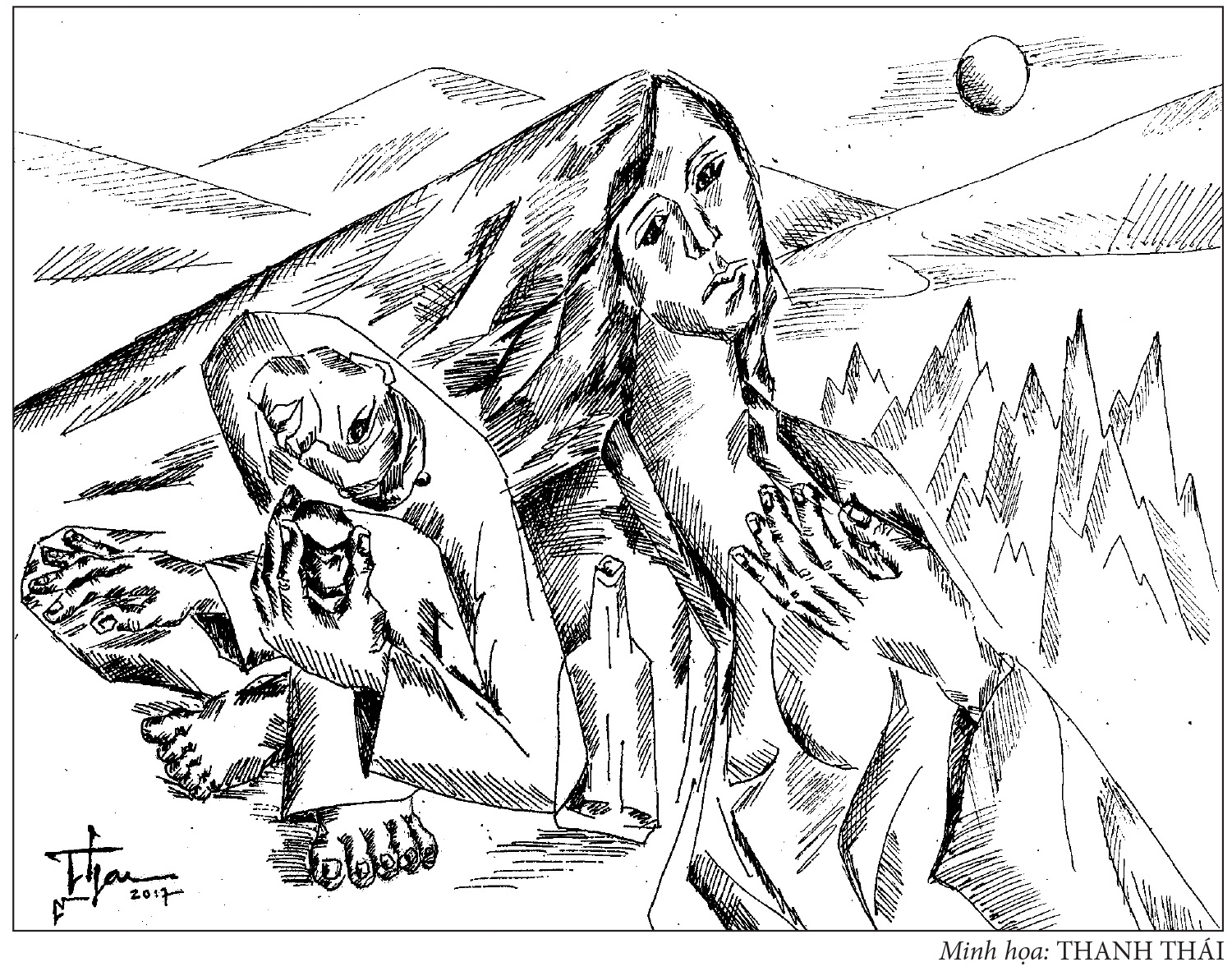 Riêm ngồi sững sờ nghe Han phán. Tai cô đầy những âm thanh ong ong. Riêm cúi xuống nhìn bụng mình, eo vẫn thon, ngực vẫn tròn. Riêm đưa tay sờ mông mình, nó vẫn thế. Chỉ nghe khát được chung đụng xác thịt. Với Han hoặc với bất kỳ ai. Giờ Riêm mới ý thức được điều này, cô kìm hãm nó một cách tuyệt vọng. Còn Han nói với Riêm rằng. Cô mang thai con thằng Vai nên mới thế, cái thai ấy gần hai năm rồi, cô sắp sinh con thằng Vai. Han cười, tiếng cười lung lạc cả dãy núi. Riêm thét lên, tiếng thét của cô khiến một vài con vật nào đó nhận ra nên hú lên đáp trả. Tối, Riêm bỏ cơm. Han ngồi nhìn Riêm một lúc rồi nói.
