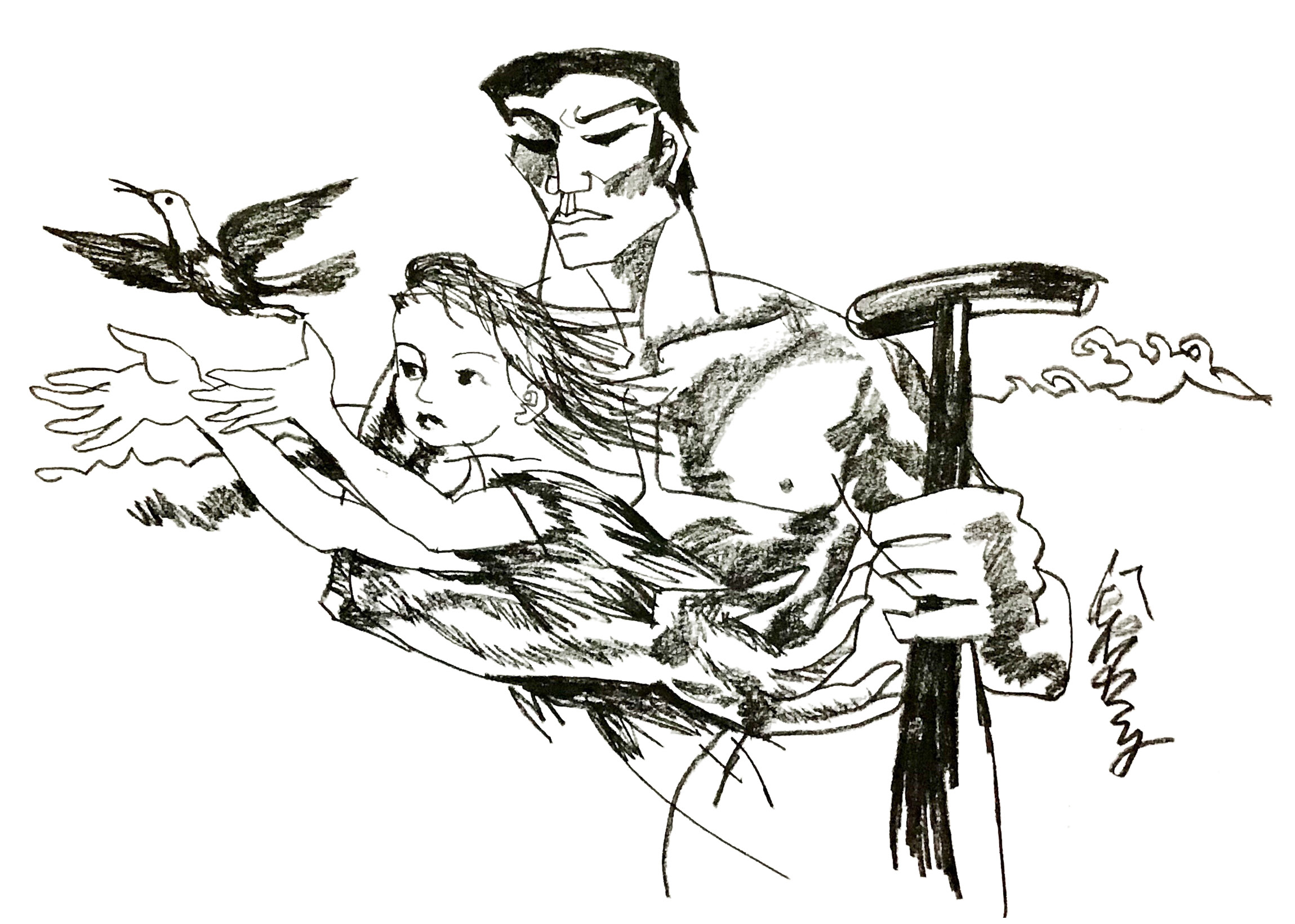 Tối ấy, con bé theo bố ra ngõ rồi đứng nhìn theo bóng bố lẫn vào đoàn người mang vác đủ thứ lỉnh kỉnh phục vụ cho chuyến ra khơi xa. Họ ồn ào đi xuống biển. Biển ầm ào. Gió thổi thông thống. Mắt nó nhòe đi.